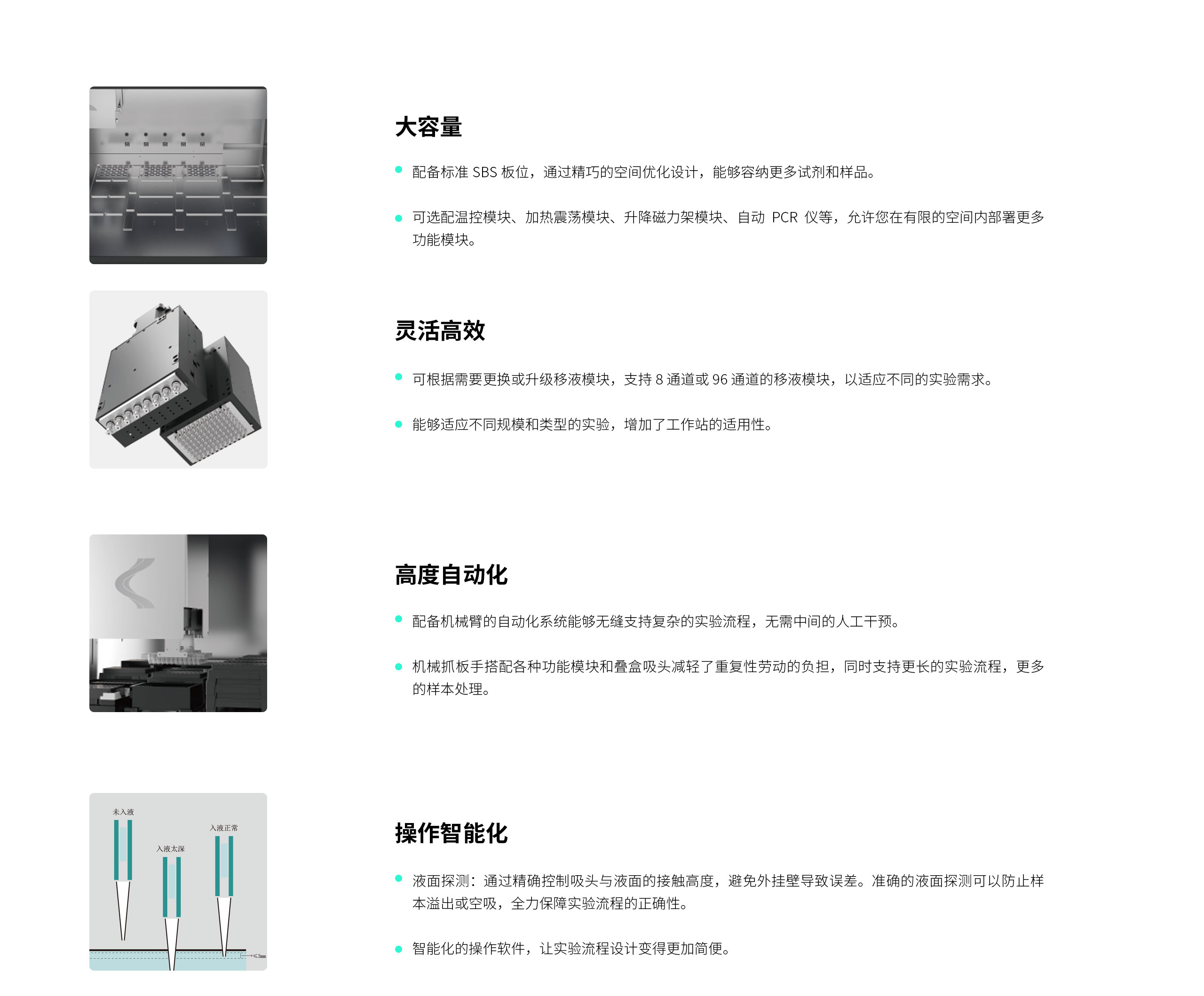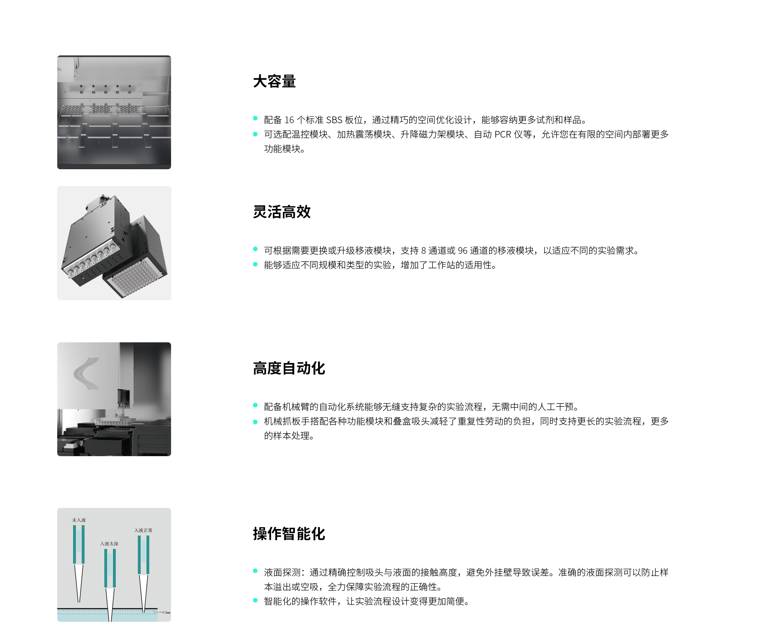✓ 液面探测精控吸头液面接触高,防外挂壁等。