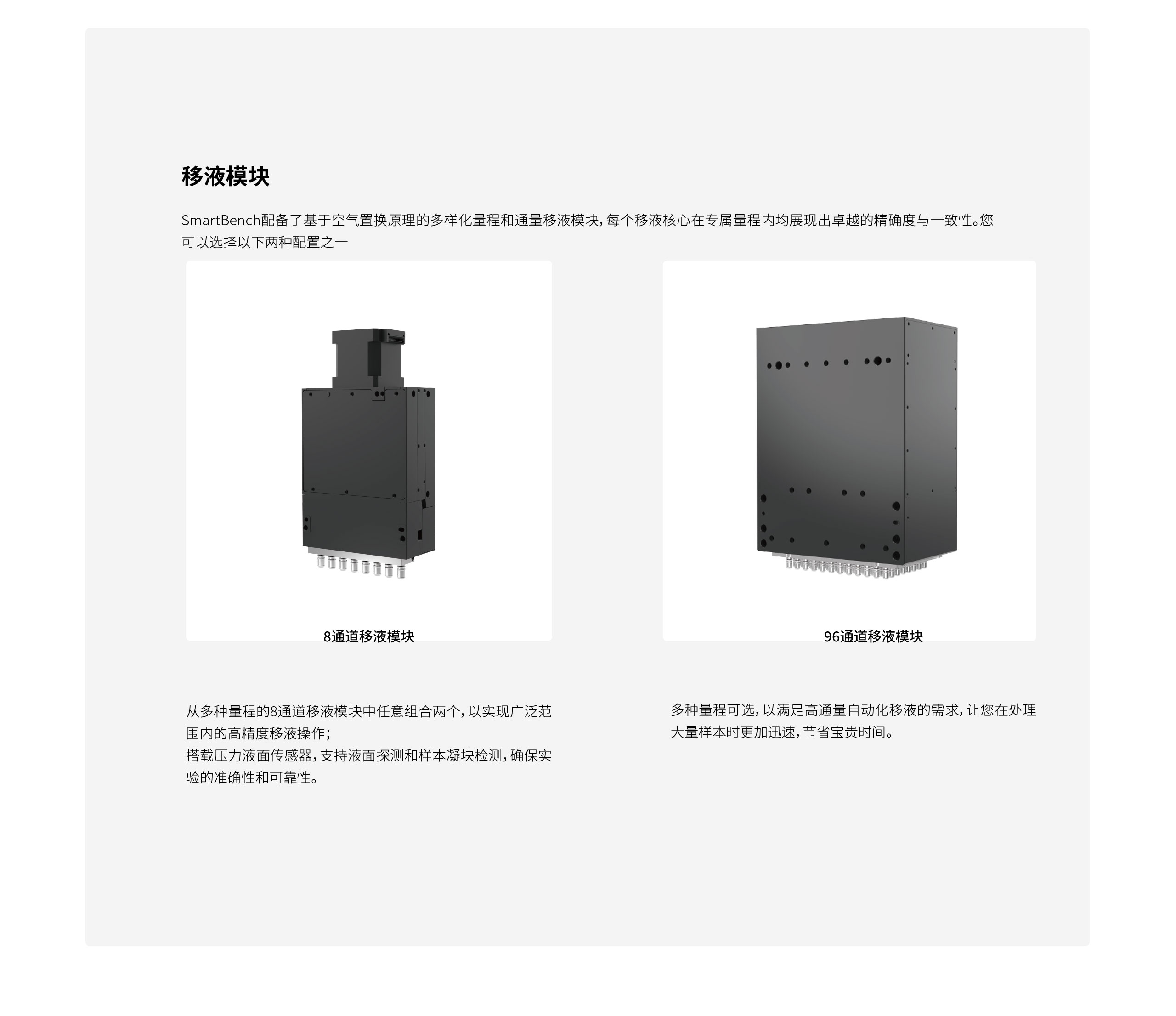✓ 可更换升级移液模块,支 8 通道或 96 通道。
